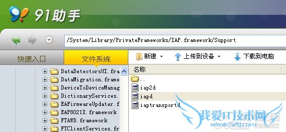 然后使用91助手iOS专业版,进入文件管理目录/System/Library/PrivateFrameworks/IAP.framework/Support/,删除文件iapd;然后再进入目录/SYSTEM/Library/LaunchDaemons/,删除文件com.apple.iapd.plist,接着重启机子即可。