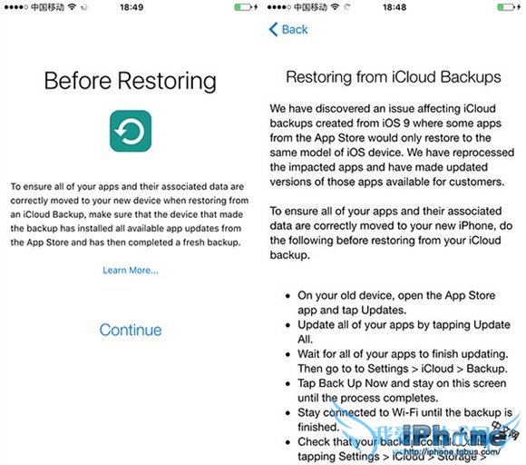 拿到iPhone6s、iPhone6s Plus进行全新激活的朋友可能已经发现,苹果已经在iCloud账户登录页面之后,给出了“还原前提示”的单独说明页,其中就给出了具体的临时解决方法,一起来看看。