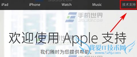 1)在苹果官网首页,点击上方一栏的【技术支持】。(如下图)