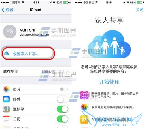 1)打开iPhone5s【设置】进入【iCloud】,点击【设置家人共享】,点击【开始使用】。(如下图)
