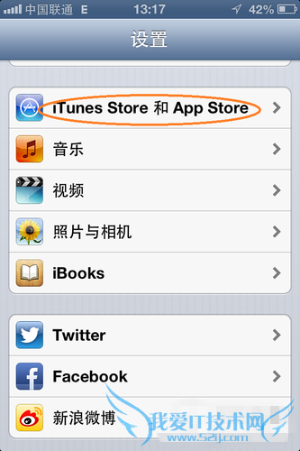 2、然后在设置选项里,找到“iTunes Store 和 App Store”,点击进入,如图所示