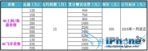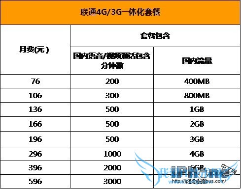 中国联通:合约机分为存费送机和购机送费两种方式。两种合约套餐月资费均为76元起步,并包括106元、136元、166元、196元、296元、396元,以及596元,共计八档,预存资费将分月返还。