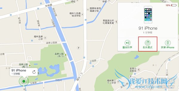 2、进入后,iCloud会根据手机的定位信息进行搜索,找到iPhone手机位置,点击绿色圆点,选择丢失模式。