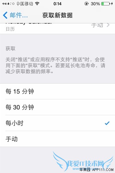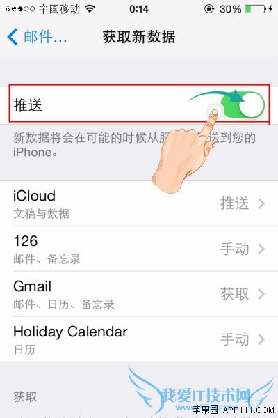第三步,在“获取新数据”页面,点击开启“推送”功能,还可以设置每15分钟、30分钟或一个小时让iPhone检查一次新邮件。
