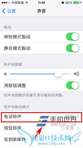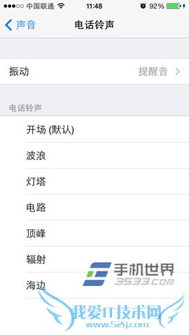 4)在“电话铃声”菜单栏里,我们可以更换来电时的振动模式,还可以更改自己所喜欢的铃声。同样,除了可以更改电话铃声以外,我们还可以更换如短信,邮件,日历提醒等的铃声。