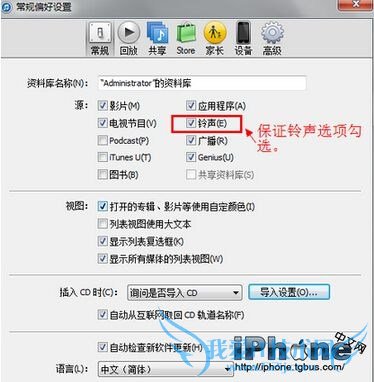 在偏好设置选项卡里,把铃声选项勾选。这是为了保证铃声选项能出现。没有前面3个步骤,以后铃声的列表没有地方查询