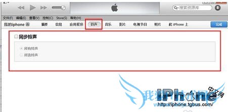 进入我的设备的资料库,选择“铃声”,勾选同步铃声,点击“同步”