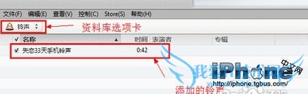 添加完毕后,在资料库选项菜单,选择“铃声”,可以看到再资料库里添加的铃声。