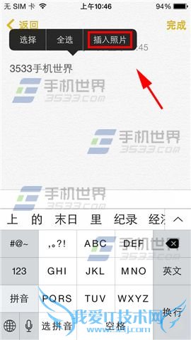 1)进入备忘录界面点击【新建】,输入内容后在双击空白处,会出现三个选项,点击【插入照片】。(如下图)
