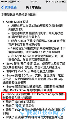 这次更新文件大小在270MB左右,iOS 9.2版本改进了Apple Music播放列表、离线保存歌曲等;为邮件增加了Mail Drop功能可以发送大附件;iBooks开始支持3D Touch;另外,这次更新给iPhone加入了“USB Camera Adapter”,你可以通过“USB Camera Adapter”从外部设备将照片导入iPhone里(要求至少iPhone 5或之后机型)。