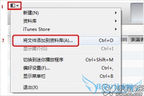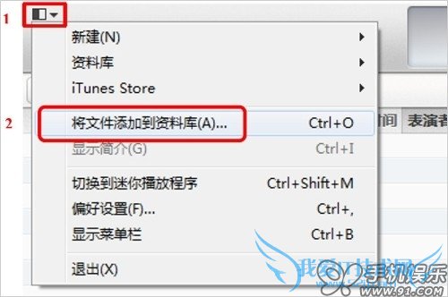 a) 点击iTunes上左上角的菜单按钮,在弹出的菜单中选择“将文件添加到资料库”,既可将准备好的音乐文件添加到iTunes的资料库。