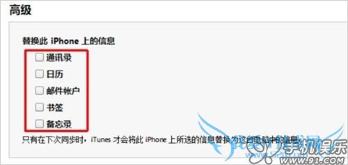在iTunes中选择同步过的项目,都可以在高级设置中选择冲突配置。在iTunes摘要页面,点击进入“信息”,找到“高级”,在高级中选项目后,再次点击同步按钮后,iTunes会使用Outlook中的数据完全覆盖掉iOS设置中对应项目的数据。