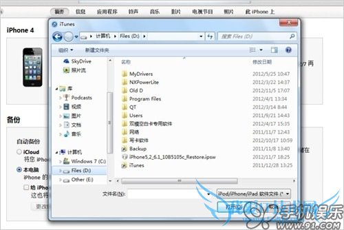 b) 也可以按住PC键盘上的“Shift”键(OS X系统上是Options键),点击“恢复 iPhone”,在弹出的对话框中选择之前已下载好设备固件进行系统恢复,恢复过程中PC要接入互联网。
