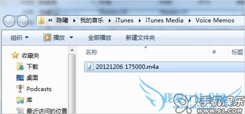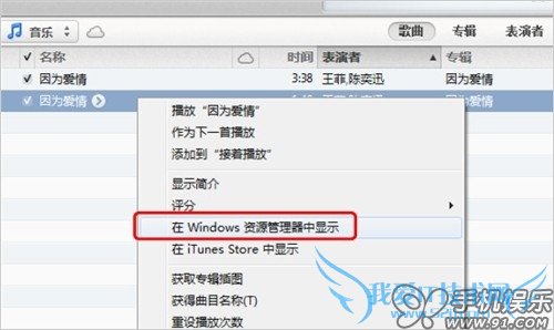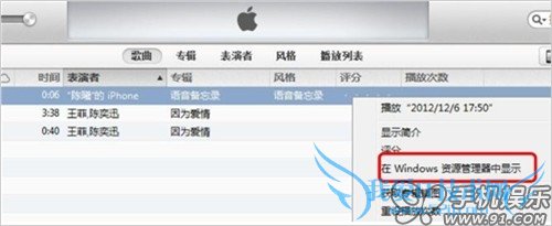 c) 在iTunes资料库中的音乐里,找到同步进去的“语音备忘录”,在上面点击鼠标右键,选择“在Windows 资源管理器中显示”,可以快速在资源管理中找到源文件。