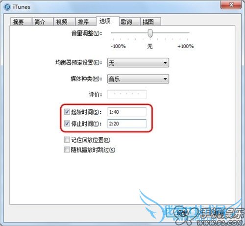 2) 在弹出的窗口TAB页中选择“选项”,在“选项”中设置“起始”与“停止”时间。(铃声不能超过40秒)完成后可以在iTunes中试听,完成后点击确定。