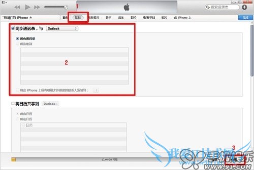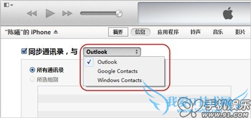 c) iTunes同步“通讯录”支持多渠道数据,同步的来源支持Outlook、Google contacts及Windows contacts。