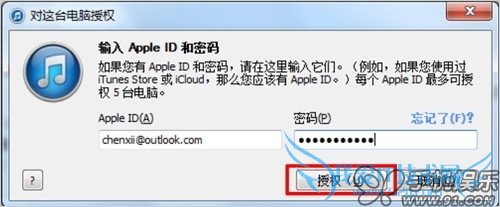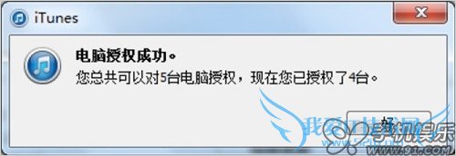 c) 完成后iTunes会提示授权成功,并显示该账号授权信息。一个Apple ID可对5台电脑授权,如果授权已使用完了,需要在之前的电脑上取消一个授权才可以继续使用。
