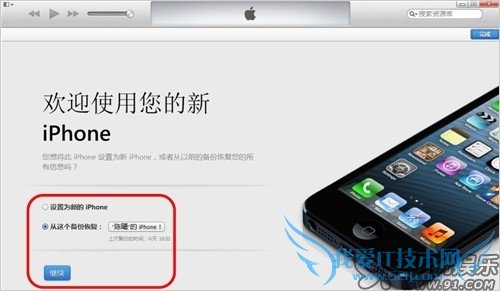 c) 如果iPhone之前在当前PC上有过同步或备份,则会看到以下的界面,在这里可以根据需求,选择从备份回复或设置为新iPhone。