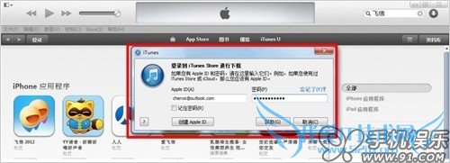 b) 找到需下载的应用后,点击免费或价格,在弹出的对话框中输入Apple ID及密码后,点击“获取”按钮即可下载。如果之前已登陆过Apple ID,并且输入密码后不足15分钟,那么iTunes是不会要求再次输入密码的,系统会直接进入下载页面。付费软件要求Apple ID必须充值或捆绑信用卡。
