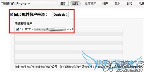 a) 在iTunes摘要页面,点击进入“信息”,在信息中勾选“同步邮件账户来源”,选择同步来源Outlook,点击“应用”后同步,既可将Outlook中的邮件配置(不包含密码)合并同步至iOS设备中。iTunes会自动显示Outlook中的可支持同步的账户信息。