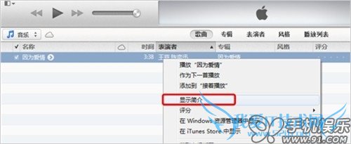 1) 在iTunes资料库的音乐中找到需要制作铃声的原始音乐,点击鼠标右键选择“显示简介”,
