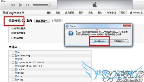 c) 如果要删除照片,只需要取消“同步照片”前或对应用文件夹前的复选框,在弹出的对话框中选择“移除照片”,点击同步,即可删除。