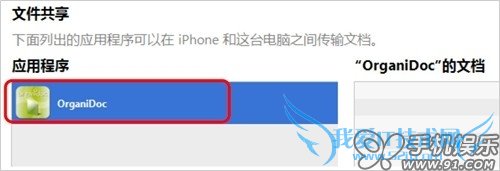 a) 在iTunes的摘要页面,点击“应用程序”,找到“文件共享”,在文件共享中点击OrganiDoc,