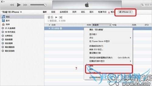 f) 进入iTunes的摘要页面,点击进入“在此iPhone上”,找到不需要的音乐,点击鼠标右键既可删除。