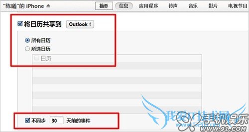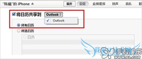 a) 在iTunes摘要页面,点击进入“信息”,在信息中勾选“将日历共享到”,选择同步来源Outlook,点击“应用”后同步,既可将Outlook中的日历合并同步至iOS设备中。同步之前可以根据需求,选择同步所有日历或所选日历,也可以选择同步指定范围的事件。