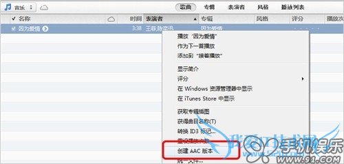3) 在试听好的音乐文件上点击鼠标右键,选择“创建AAC版本”