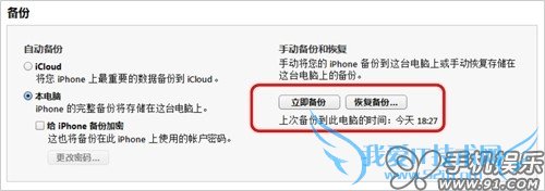 a) 在iTunes的摘要页面,点击“立即备份”与“恢复备份”,可以实现iOS设备整机进行备份与恢复。