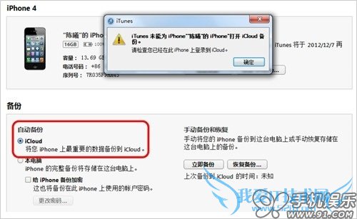 b) 需要注意的是,在iOS设备中没有登陆iCloud服务时,备份文件只能存放在PC系统盘本地文件中的。点击iCloud备份会提示没有登陆。