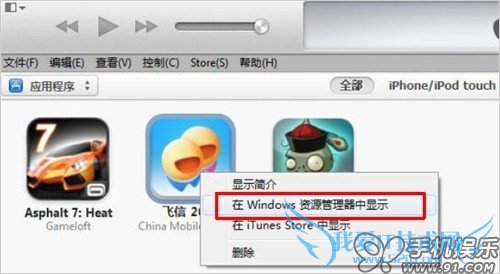 g) iTunes资料库中找到回传的应用,在应用上面点击鼠标右键,可以在PC资源管理器中找到对应的iPA安装包。