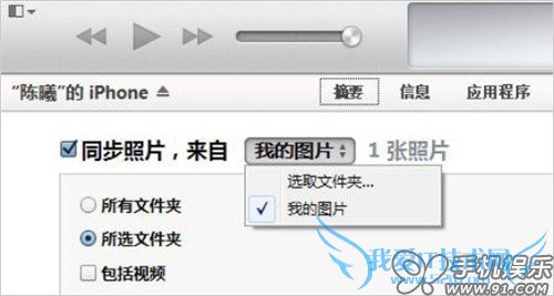 a) 在iTunes摘要页面,点击进入“照片”,在照片中勾选“同步照片”,选择来自我的图片,选择需要同步的文件夹,点击右下角的应用即可完成照片同步。同步的照片会出现在iOS设备的“照片”中,并生成与文件夹同名的相册。