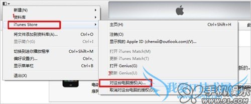 a) 将iPhone与iTunes连接,点击左上角的菜单,进入iTunes Store-对这台电脑授权,输入iOS设备上下载应用程序时所用的Apple ID进行授权。