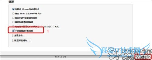 d) 进入iTunes的摘要页面,找到“选项”,选择手动管理音乐,点击“应用”按钮即可生效;
