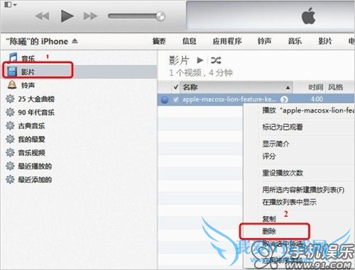 e) 进入iTunes的摘要页面,点击进入“在此iPhone上”,找到不需要的影片,点击鼠标右键既可删除。