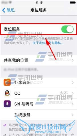 2)接着点击【定位服务】一栏,最后开启【定位服务】右边滑块即可。(如下图)
