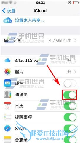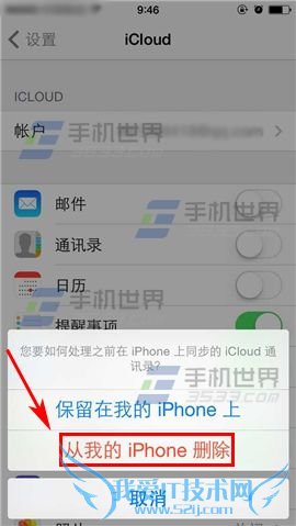 2)接着关闭【通讯录】右边滑块,再点击【从我的iPhone删除】,然后把你的号码导入即可。(注:iPhone6S号码导入方法)(如下图)