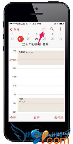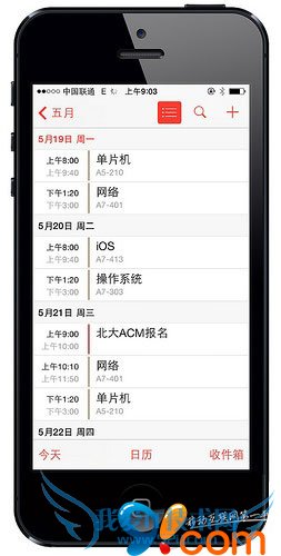 在添加好所有的课程之后,如何才能让它在 iOS 7 的日历中更好的显示出来呢?这里有一个小技巧:将日历的「时间线展示」方式切换为常见的「列表展示」方式,让课程表的查看更加直观。具体操作步骤如下: