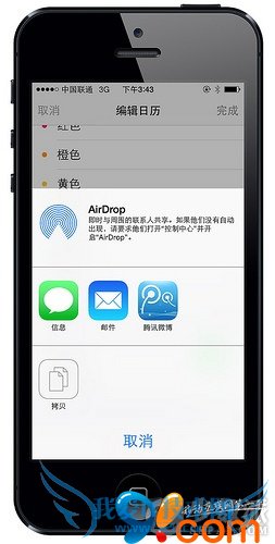 可以选择通过 AirDrop、信息、邮件和微博的方式直接分享,也可以选择「拷贝」当前日历链接,将其发给某人或发布到某处,接收者可通过点击链接直接订阅该日历(课程表)。
