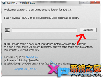 打开evasi0n7.exe,如果是win7,使用管理员模式打开