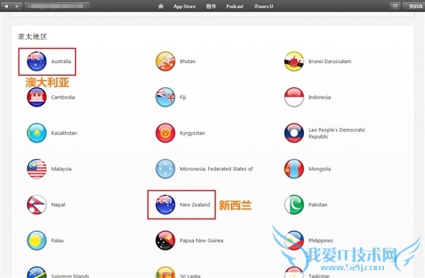 第一步:找到对应下载区。打开你的iTunes,如果当前区域并非的新西兰区、加拿大区或澳大利亚区,请点击iTunes底部右下角的中国图标按钮,点击后进入地域选区;