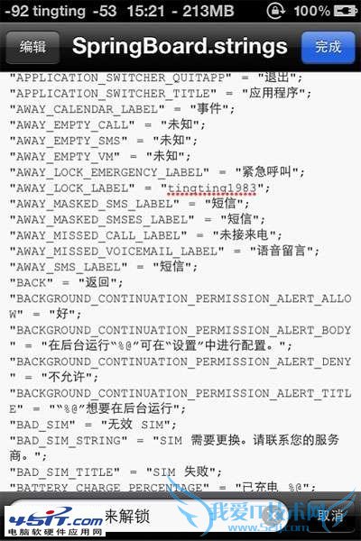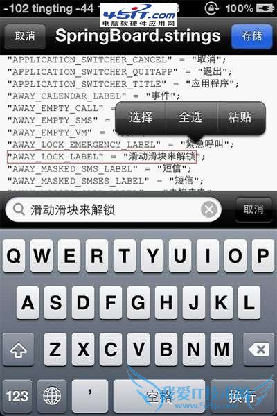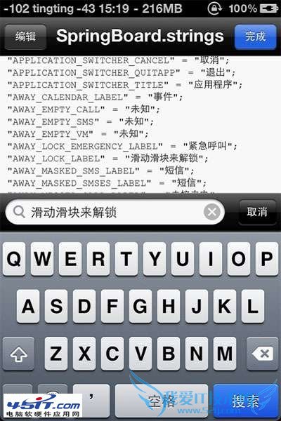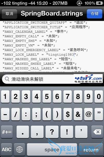 为啥我不用电脑来修改滑块文字呢?因为SpringBoard文件用记事本打开是乱码,所以只有借助iFile来修改。其实主题的天气城市等等也是可以使用iFile来修改的,这个我就不在这里介绍了。
