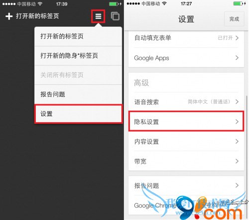 使用Chrome的用户,单击右上角的“三”进入设置,在“隐私设置”中,可以分别清除浏览记录、缓存、cookie,或者全部清除。其他第三方浏览器清除的步骤大致相同。