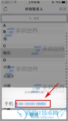 2)接着点击【手机号码】即可添加到个人收藏。(如下图)