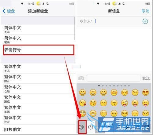 三、找到【表情符号】,点击即可添加。然后你便可以在键盘中点击“小地球”快速切换到表情文字键盘(有木有顿时感觉自己萌萌哒~)