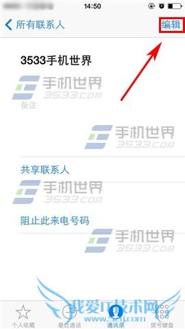 1)进入联系人界面选择一个【联系人】进入,再点击右上角【编辑】。(注:来电大头照设置方法请参考本文中相关教程)(如下图)