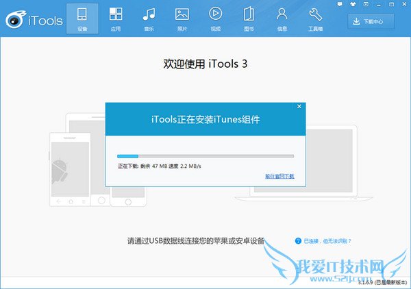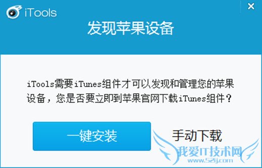 1)将新版iTunes完全卸载后,打开iTools PC端,将设备连接至iTools PC端会提示需要安装iTunes组件,点击【一键安装】后会自动下载安装。(若卸载iTunes组件后未提示“下载iTunes组件”的弹窗,建议您重新重新下载最新版安装)