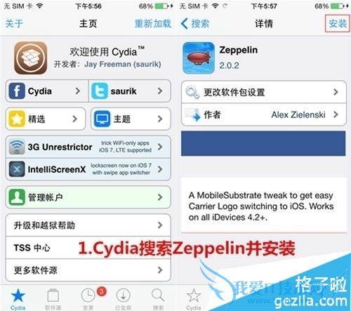 1 、打开 Cydia ,依次点开管理 - 软件源 - 编辑 - 添加“ apt.feng.com ”(或“ apt.modmyi.com ”等其它源),然后搜索 Zeppelin 进行安装。